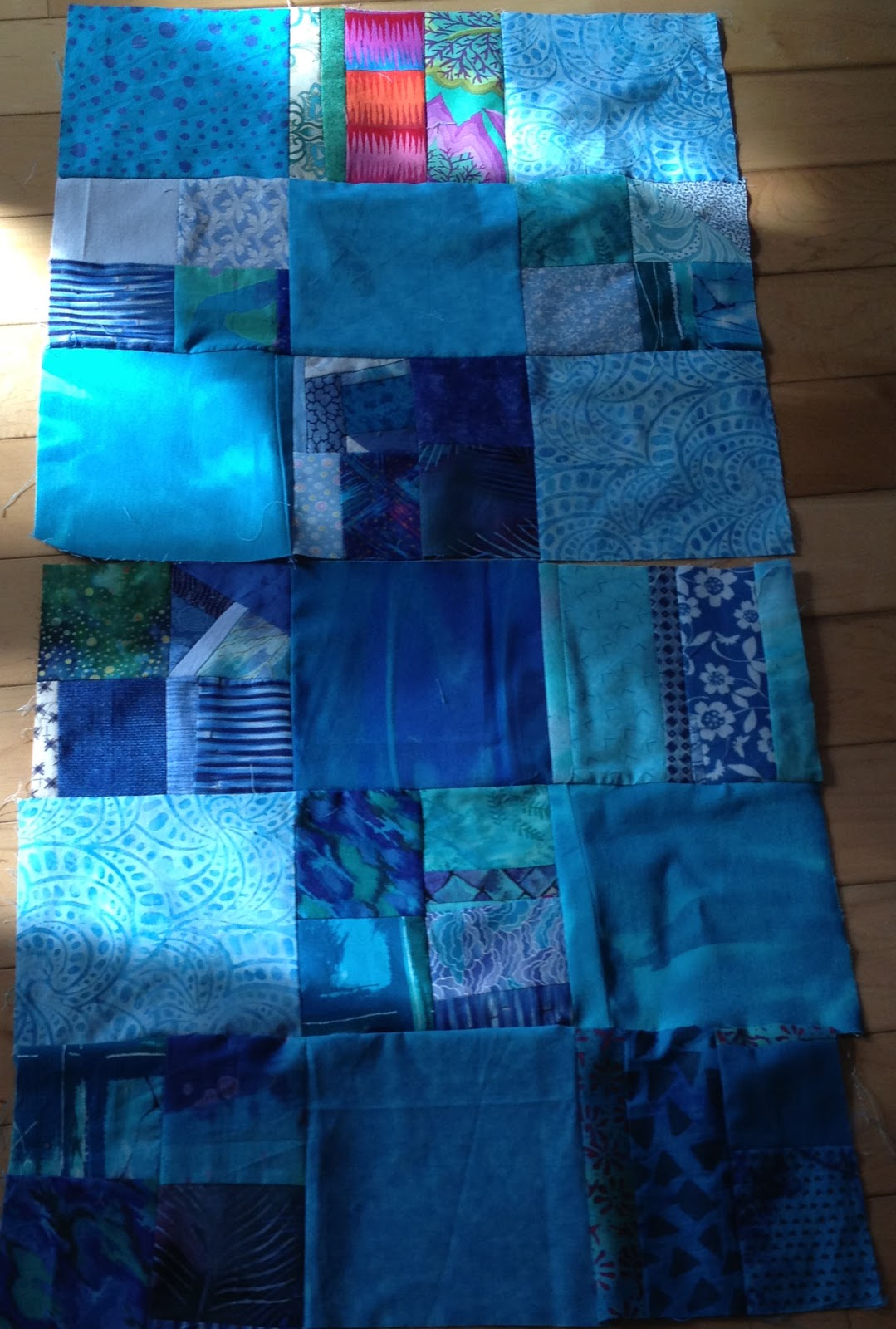 I'm working on these sort of in the background, while trying to focus on the shirt quilt. This is LibRR, round 2 "squares" am thinking of placing these crumb squares on point set with neutral triangles, other suggestions? This piece is also known as Liberating the Blues #3.